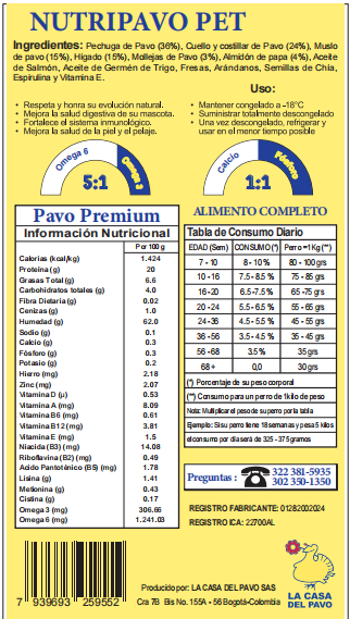 Cuello de Pavo (15%), Hígado de Pavo (15%), Costillar de Pavo (6%),
